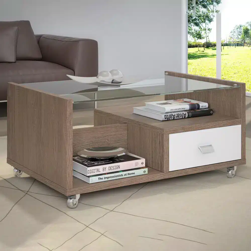 ترابيزة انتريه بعجلات متحركة يسهل نقلها وتنظيف المكان تحتها وتحتوي على سطح زجاجي وأرفف متعددة لتخزين الكتب بالإضافة إلى درج لتخزين الأشياء الصغيرة، وتصميمها يوفر حلول تخزين ذكية للمساحات الصغيرة، مما يجعلها مناسبة لغرف المعيشة العصرية.