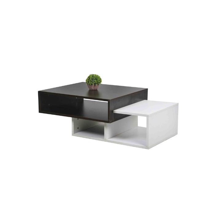 ترابيزة انتريه مكونة من جزئين متداخلين مع بعضهما في انسجام، السطح العلوي باللون البني الغامق وبه رف داخلي، والسطح السفلي باللون الأبيض ومكون من رفين.