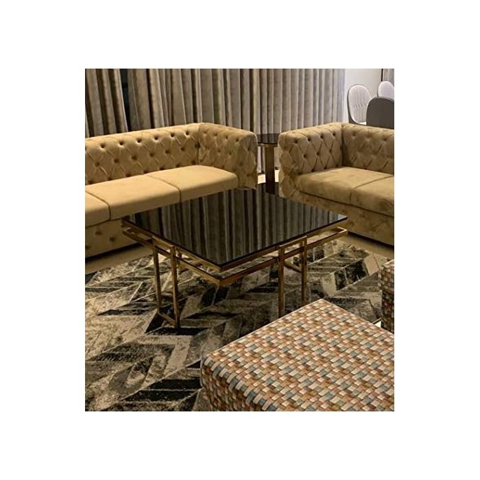 تتكون الترابيزة من سطح زجاجي شفاف يتميز بصلابة ممتازة بالإضافة إلى أنها مدعومة بهيكل معدني من الفولاذ مزدوج باللون الذهبي البراق.