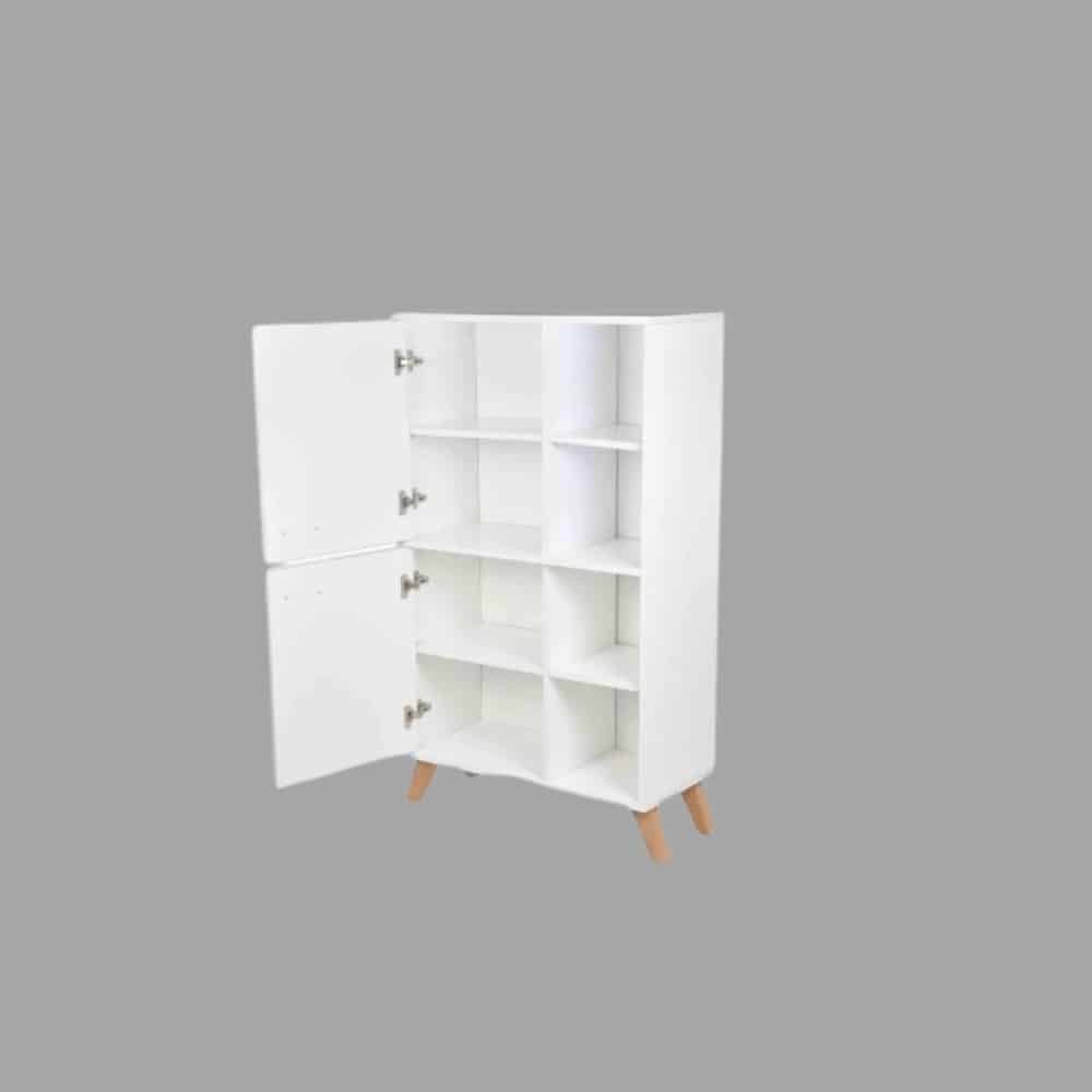 دولاب تخزين باللون الأبيض يمكنك تخزين الأشياء فيه والمستلزمات بشكل منظم وجميل، ويحتوي على العديد من الرفوف التي تسهل التنظيم والترتيب. كما يمكن استخدام الدولاب كمكتبة خشب منزلية صغيرة أو طاولة تزيين لعرض الأشياء.