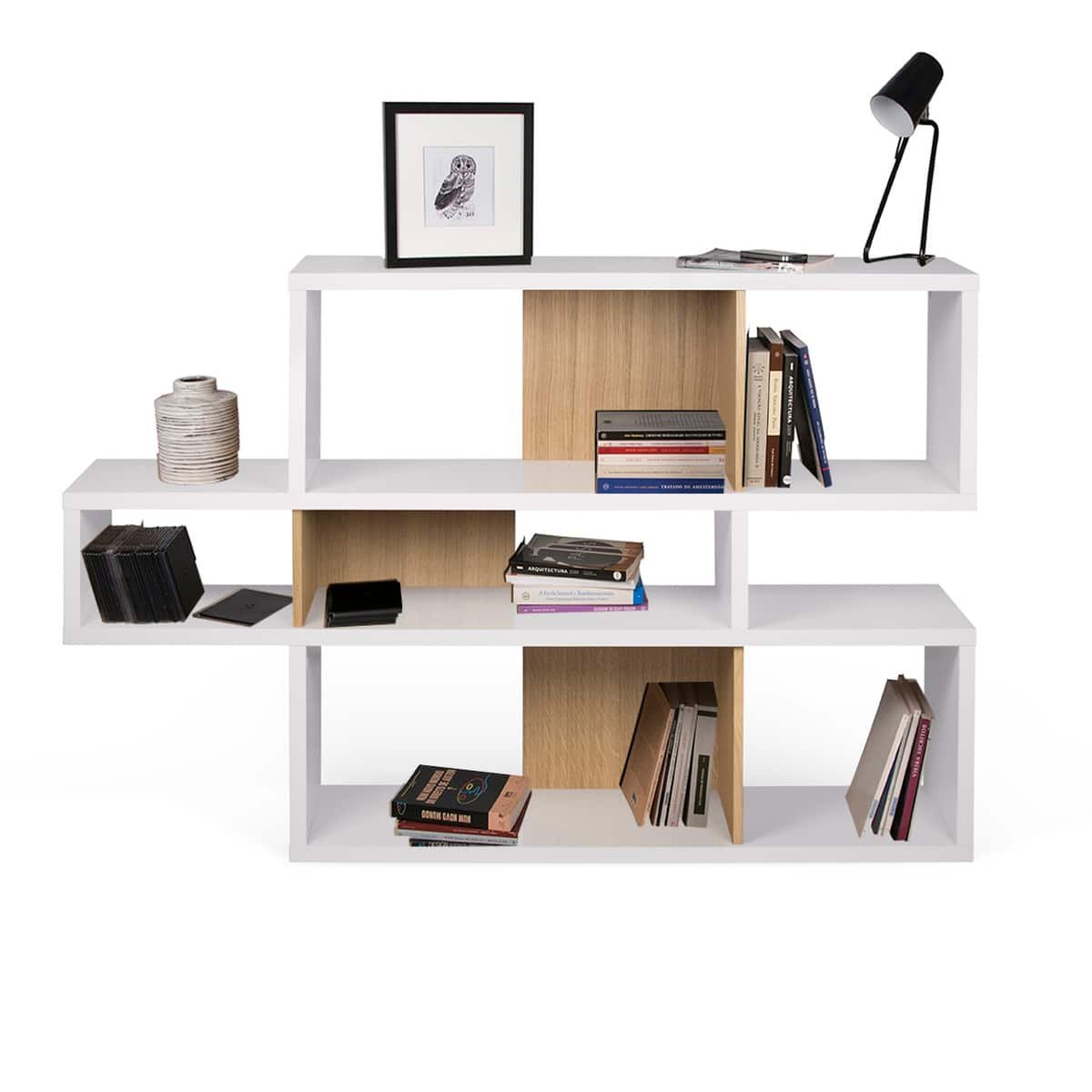 تأتي وحدة رفوف خشبية للكتب بتصميم يدمج بين اللون الخشبي الرائع مع اللون الأبيض مما يعزز الطابع العصري ويضفي لمسة جمالية على المكان. من المؤكد أن تتناسب هذه الألوان مع أنماط مختلفة من الديكور الداخلي وتعزز من جمالها وأناقتها.