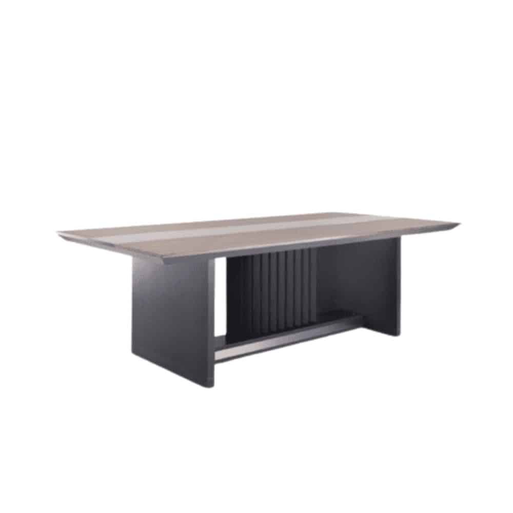 تصميم الطاولة: الطاولة على شكل مستطيل تم تصنيعها من الخشب باللون البني الداكن مع تشطيب رمادي غامق في تناغم لوني رائع يجعل الطاولة تتناسب مع كافة أنماط الديكور المختلفة وتندمج مع باقي مفردات الأثاث المكتبي.