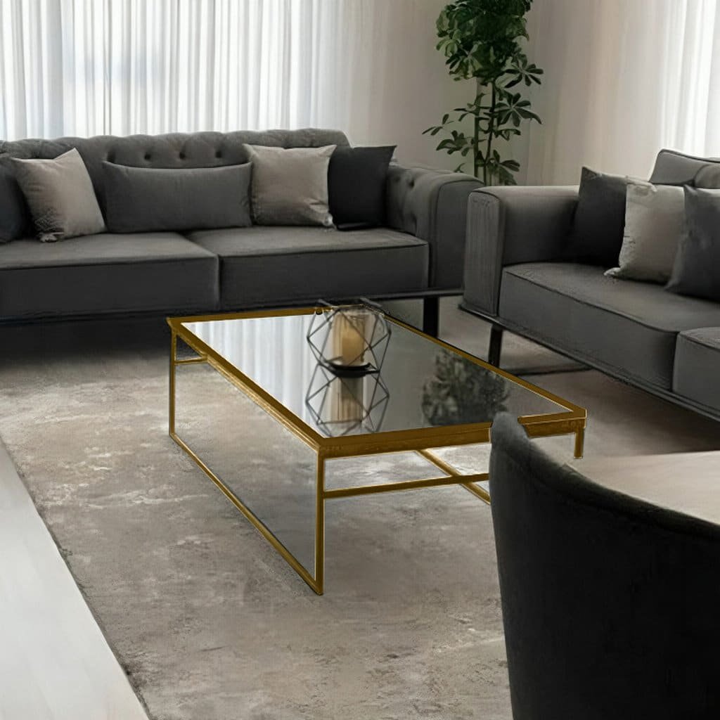 نقدم لكم طاولة وسط لغرفة الجلوس بتصميم بسيط وجذاب، الهيكل معدني باللون الذهبي الفاخر والسطح من الزجاج عالي الجودة والتحمل، والأبعاد على شكل مستطيل لتوفير مساحة واسعة على السطح.