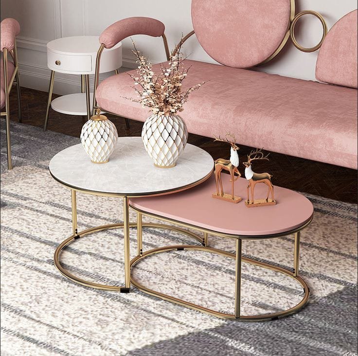 طقم الترابيزات مصمم بشكل عصري وحديث مما يوفر لك مظهر شيك. متوفر بألوان ذهبي للشاسيهات وأبيض وروز للسطح، يمكنك اختياره ليتناسب مع ديكور المنزل الخاص بك ويزيد من جماله.