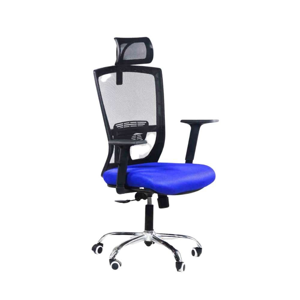 كرسي مكتب أسود وأزرق مصمم لراحتك ورفاهيتك بتحقيق أفضل وضعية جلوس بفضل دعامة الفقرات القطنية بمسند الظهر الشبكي ومسند الرأس ومساند الذراعين المجتمعين لتشكيل منظومة مكتملة من راحة فقرات الظهر وعضلات الجسم.