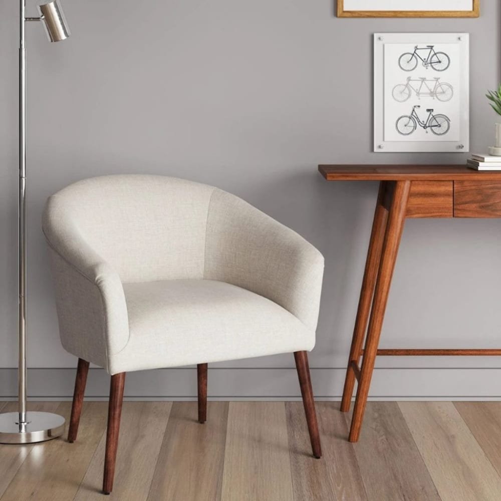 - التشطيب: كرسي مودرن بيج ثابت بأرجل مطلية تعطي لمعان جذاب يمتزج مع النسيج البيج بشكل مثالي.