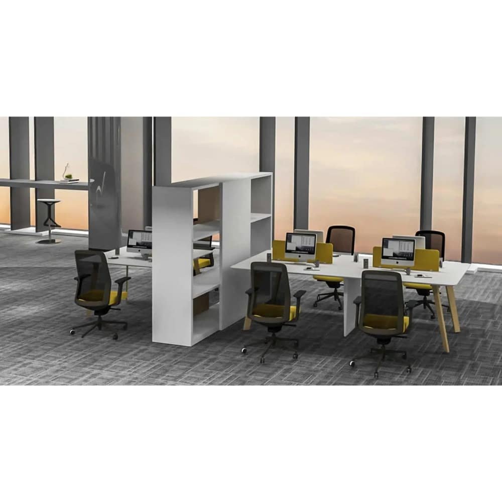 محطة عمل ل 6 أشخاص مع مكتبة خشب كبيرة والتي تعتبر صيحة في عالم الأثاث المكتبي من حيث التصميم من ناحية والفوائد التي تحققها لجهة العمل من ناحية أخرى.