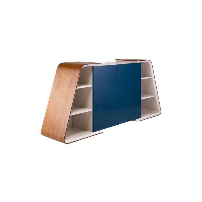 تقسيم المكتبة: تتكون المكتبة من أرفف مفتوحة على الجانبين بمقاسات متدرجة، يمكن الاستفادة منها في ترتيب الكتب والأوراق أو القطع الفنية المختلفة، بالإضافة إلى أبواب منزلقة بالوسط بداخلها منطقة تخزين تحتوي أرفف لتنظيم الأغراض وحمايتها من التلف أو الضياع.
