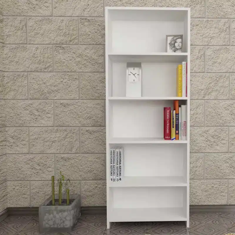 وحدة رفوف كتب تتميز ببساطتها وتعدد استخداماتها. تحتوي على خمس رفوف لترتيب الكتب والأغراض الشخصية بطريقة منظمة ومرتبة. اللون الأبيض يجعلها تناسب أي ديكور في المنزل وتصميمها العمودي يساعد على استغلال المساحات الصغيرة، إليك مواصفاتها بالتفصيل: